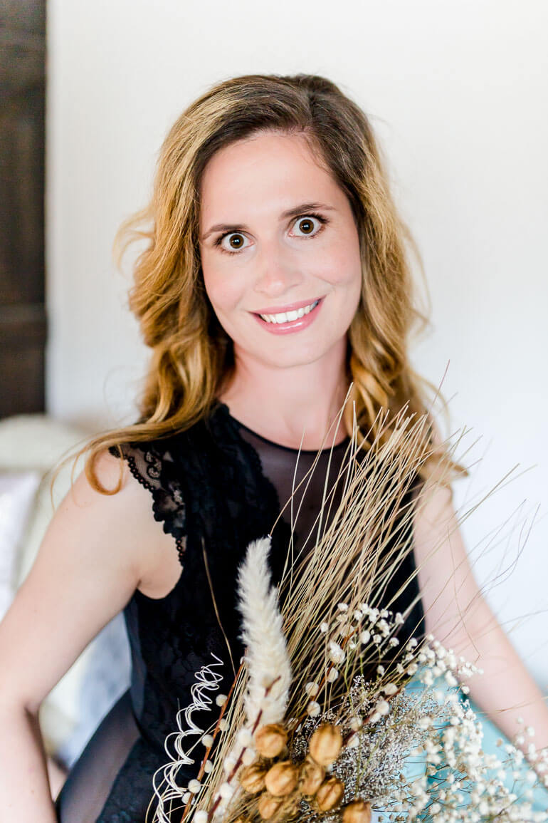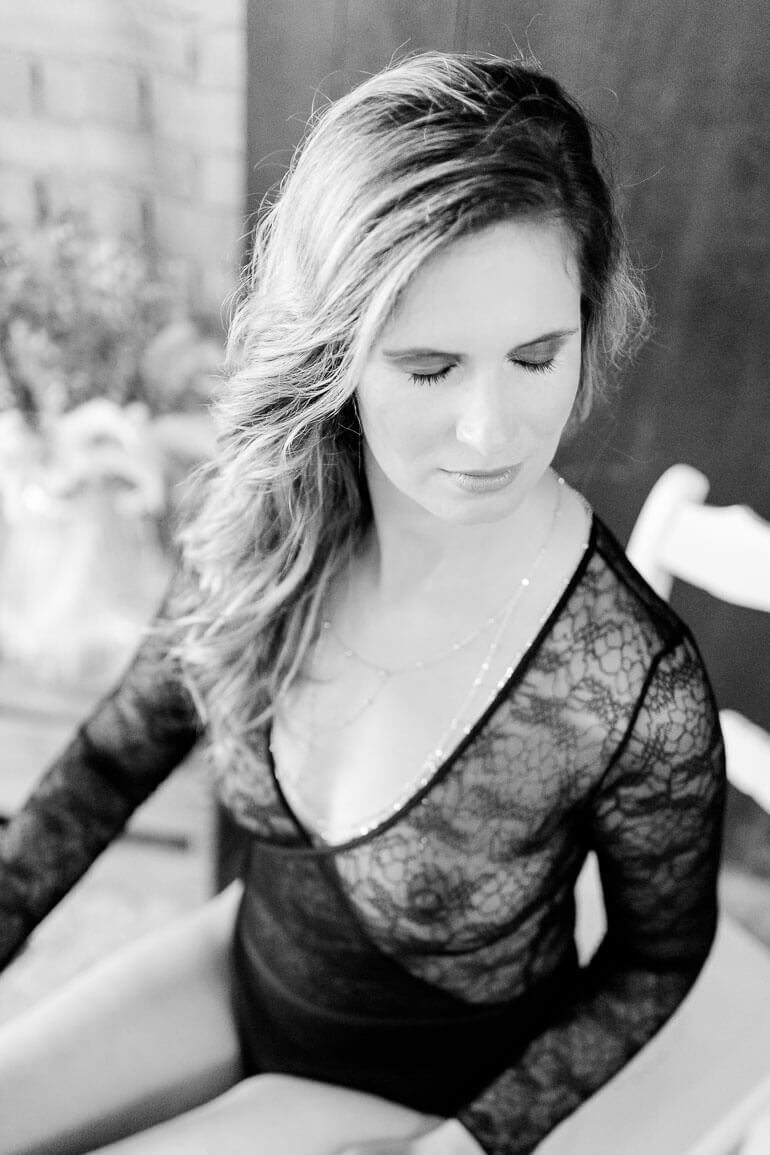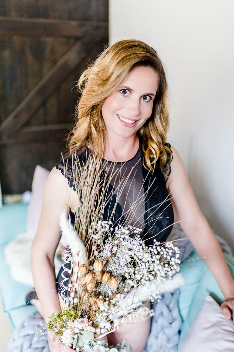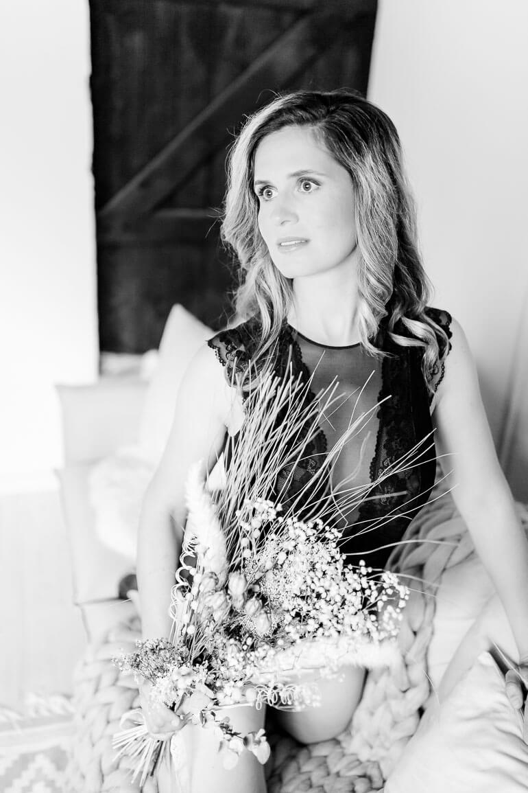 Für das Boudoir in einem Studio in der Nähe von Hamburg hätten wir uns eigentlich warm anziehen müssen, den der ehemalige Stall ist relativ kühl. Nichts desto Trotz trägt Bella zwei verschiedene schwarze Spitzenbodies, die gut mit ihrer hellen Haut und den blonden Haaren harmonieren. In dem Studio gibt es eine rustikale Backsteinmauer, die einen tollen Kontrast zu den zarzen Dessous gab. Als Accessoires für das Boudoir-Shooting hat Bella Trockenblumen bei Mandy von MF Traumblüte gekauft, die wunderbar zur Location gepasst haben.